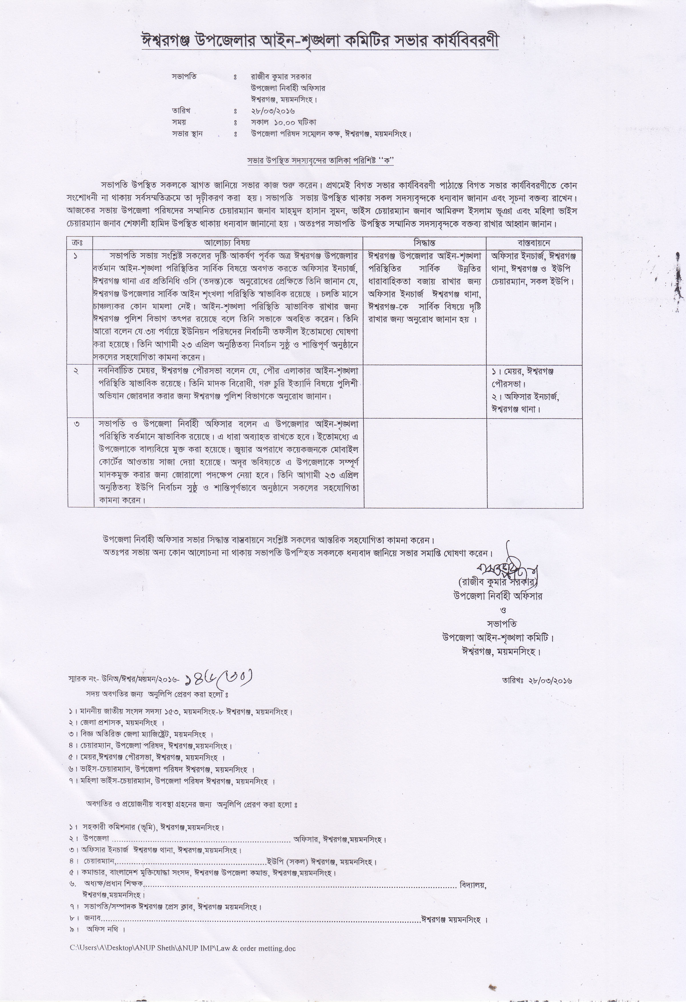 ঈশ্বরগঞ্জ উপজেলার আইন-শৃঙ্খলা কমিটির সভার ও উপজেলা পরিষদ সমন্বয় কমিটির সভার কার্যবিবরণী।
